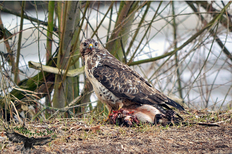 Die mitunter schönsten Motive geben Vögel ab. Doch leider sind auch sie oftmals sehr scheu und vor allem schnell. Daher sind gute Aufnahmen von scheuen Wildvögeln trotz 300er oder 500er Objektive recht schwierig zu bekommen, oder man wartet lange Zeit in einem Versteck. Einmal hatte ich bisher die Gelegenheit, sehr dicht an einen Bussard heran zu kommen. Aber auch nur, weil er ein großes Beutetier geschlagen hatte, mit dem er nicht so einfach davon fliegen konnte und es auch nicht loslassen wollte.